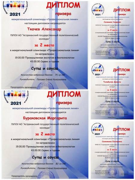 Студенты гр. ПК-282 отделения сервисных технологий и дизайна приняли участие в межрегиональной олимпиаде «Профессиональная линия» по направлению 19.00.00 Промышленная экология и биотехнологии 43.00.00 Сервис и туризм «Супы и соусы» которая прошла на базе КГБПОУ «Ачинский торгово-экономический техникум».