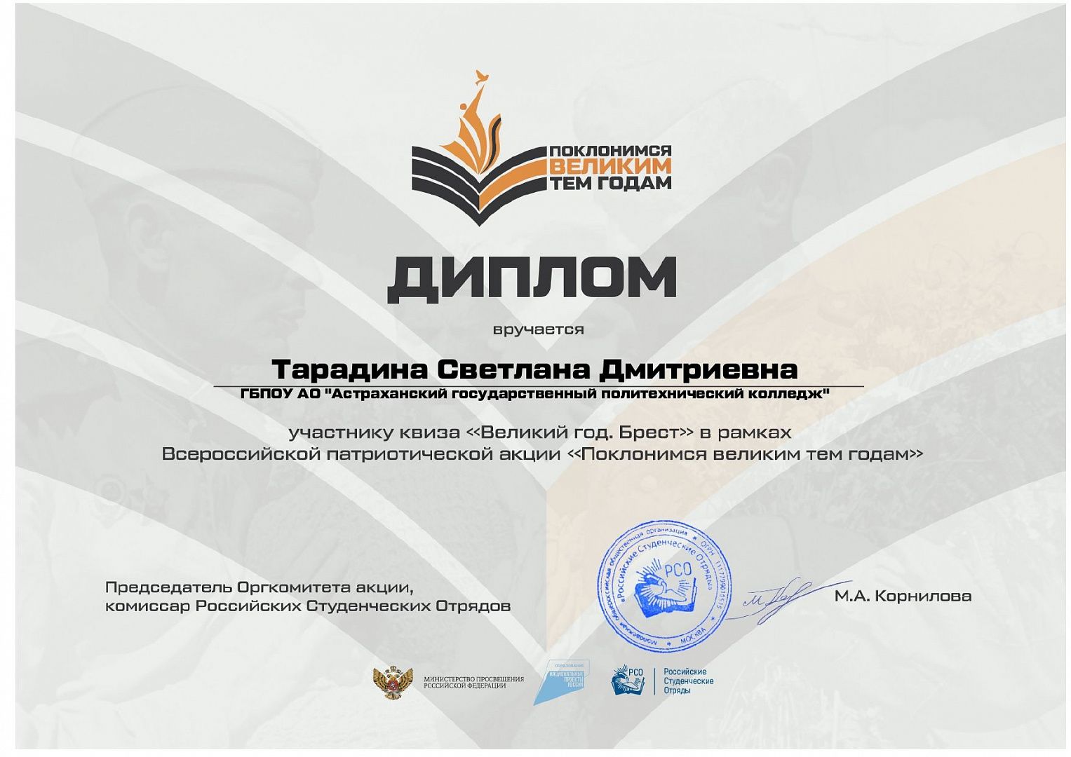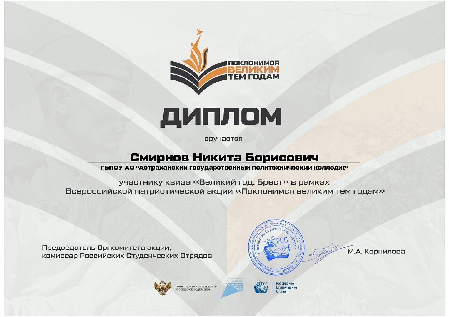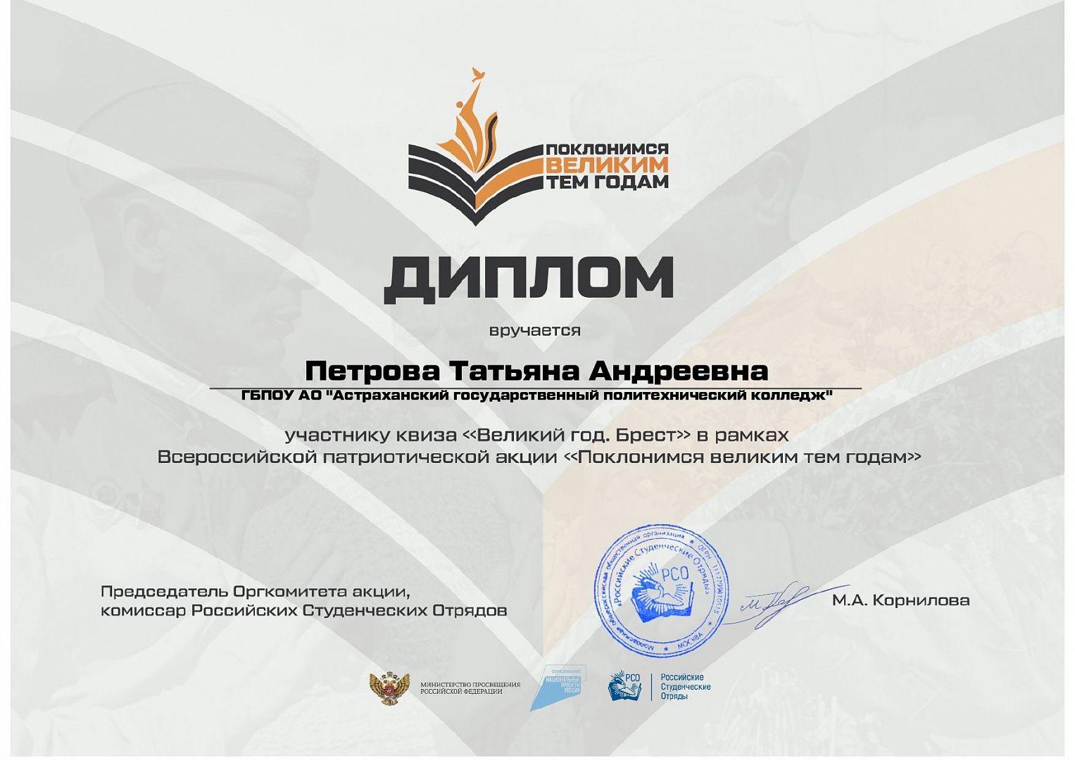 Сегодня в Астраханском государственном политехническом колледже в рамках Всероссийской патриотической акции «Поклонимся великим тем годам» прошёл онлайн-квиз «Великий год. Брест». В нём приняли участие студенты 1-2 курсов отделения информационных технологий, экономики и права.