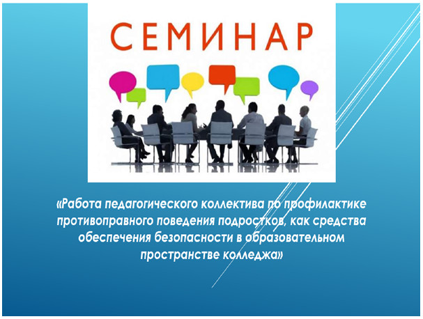 Наш семинар посвящен проблемам безопасности в колледже. Тема семинара: «Работа педагогического коллектива по профилактике противоправного поведения подростков, как средства обеспечения безопасности в образовательном пространстве колледжа». Мы поговорим о некоторых угрозах, которым подвержены студенты и педагоги колледжа и обсудим наши дальнейшие совместные действия по усилению профилактики противоправного поведения студентов.