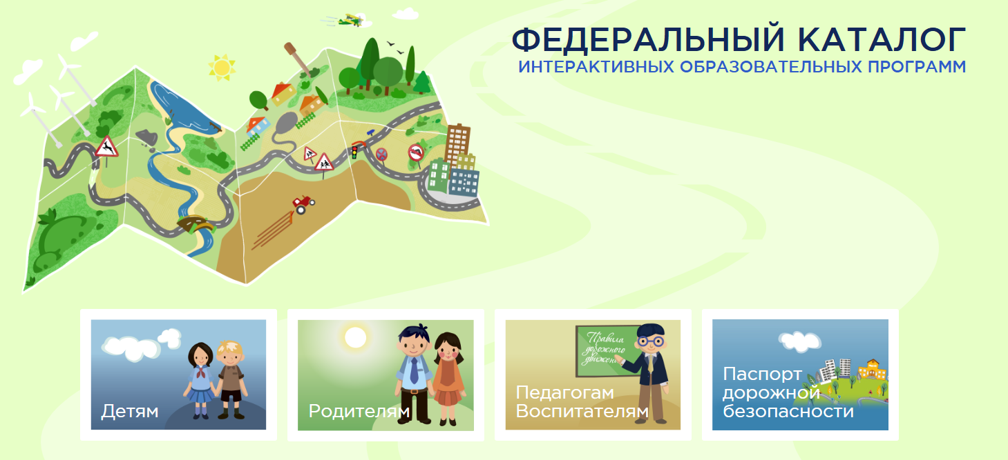 Федеральный каталог интерактивных образовательных программ «Дорога без опасности» позволяет использовать электронные образовательные ресурсы по обучению детей и их родителей безопасному дорожному движению. Портал включает в себя раздел для детей, родителей и педагогов, новостной блок и нормативные документы |