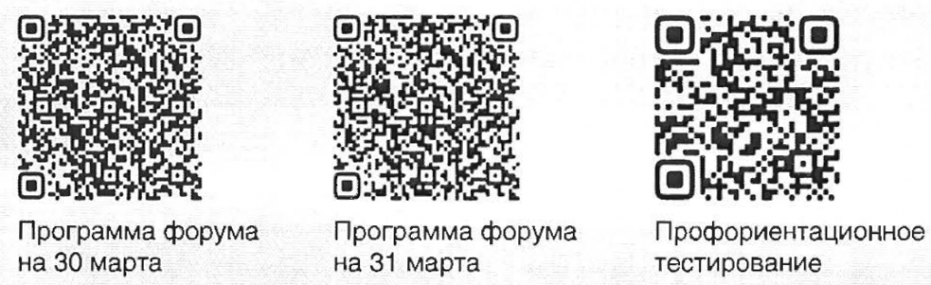 Мы предоставляем возможность бесплатного участия в данном мероприятии, которое будет проходить 30-31 марта 2023 г. Заявки на участие в форуме принимаются до 29 марта 2023 г. Зарегистрироваться на профориентационный онлайн-форум и ознакомиться с программой можно отсканировав ОR-коды ниже.