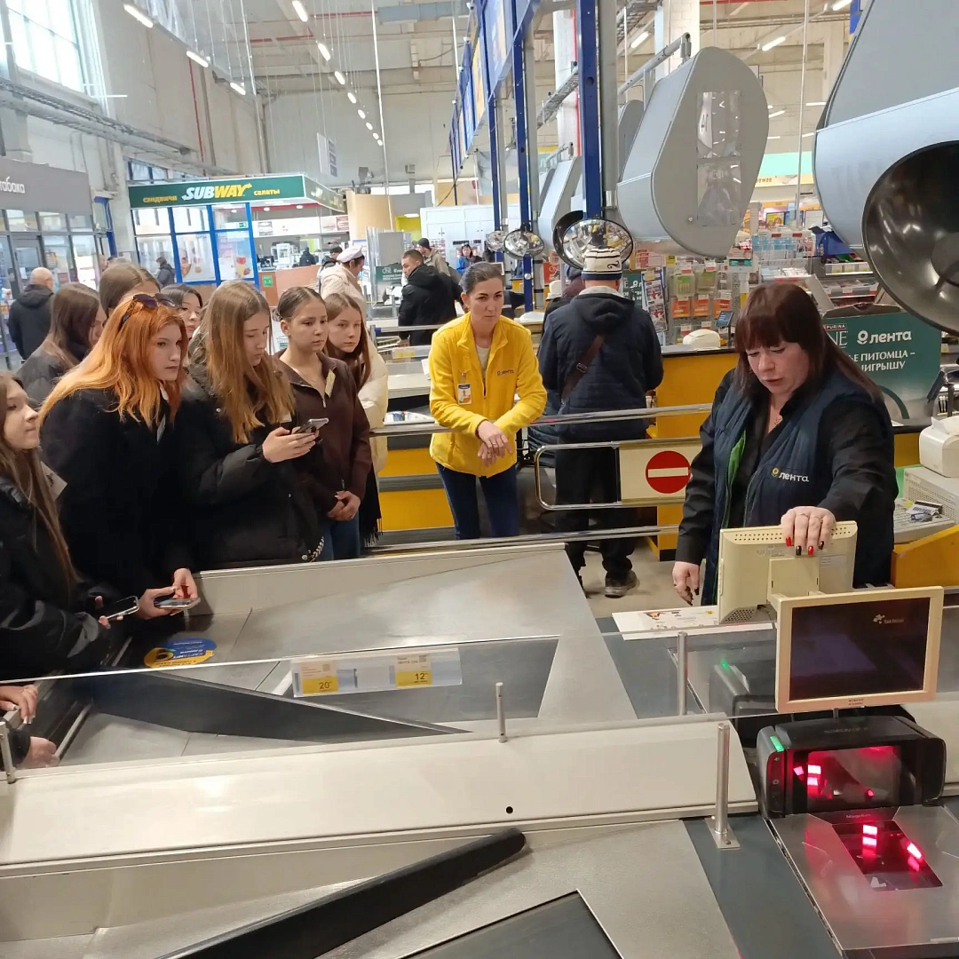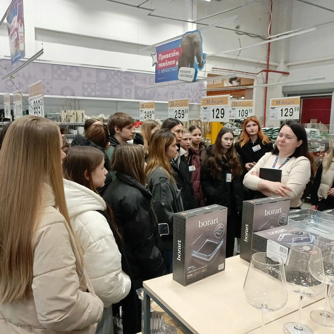 В ходе экскурсии будущие специалисты изучили организацию работы кассовой зоны, понаблюдали за взаимодействием кассиров с покупателями и особенностями обработки товарных позиций, посетили складские помещения гипермаркета, где ознакомились с принципами хранения, сортировки и распределения товаров, а также с системой учёта товарных запасов, узнали о логистических цепочках, обеспечивающих бесперебойное пополнение ассортимента на полках магазина, пообщались с представителями работодателя — сотрудниками гипермаркета, которые поделились практическим опытом и рассказали о требованиях к специалистам в сфере логистики и торговли.
